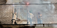Один из полицейских даже забрался на козырек крыши, но это не помогло. (фото: РИА "Новости")