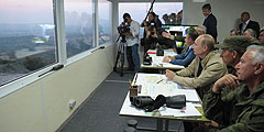 Сразу по прибытии на полигон президент отправился на командную высоту, для того чтобы лично наблюдать за военными учениями: военнослужащие отрабатывали действия частей подразделений в ходе ведения маневренной обороны на промежуточном рубеже (фото: ИТАР-ТАСС)