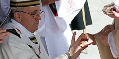 Символы папской власти: перстень рыбака (не золотой, как принято, а серебряный с позолотой) и омофор – вручены Франциску во вторник. Они символизируют обручение с Церковью и олицетворение доброго пастыря (фото: Reuters)