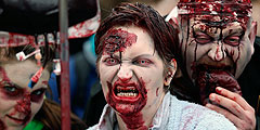 Около 800 человек, загримированных под живых мертвецов, прошлись в субботу по улицам Брюсселя. Такое необычное и пугающее шествие ознаменовало открытие международного фестиваля фантастических кинофильмов «BIFFF», который в 31-й раз заставляет встряхнуться бельгийскую столицу (фото: ИТАР-ТАСС)