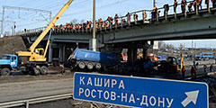 ДТП, случившееся на 36-м километре Каширского шоссе, привело к отмене рейсов аэроэкспресса в столичный аэропорт Домодедово. Грузовик MAN врезался в опору железнодорожного моста, в результате чего произошло частичное разрушение железнодорожных путей (фото: РИА "Новости")