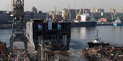 В среду была спущена на воду кормовая часть первого из двух десантных вертолетоносных кораблей-доков (ДВКД) типа «Мистраль». В соответствии с контрактом часть корабля строится в России, а часть – во Франции. Первый ДВКД будет называться «Владивосток». Во время торжественной церемонии о корму была разбита доставленная из Франции бутылка коллекционного шампанского (фото: ИТАР-ТАСС)