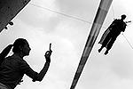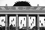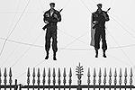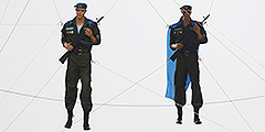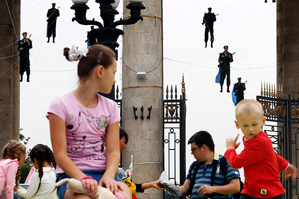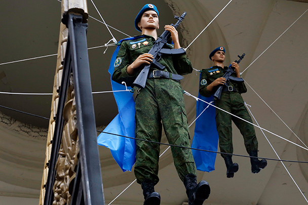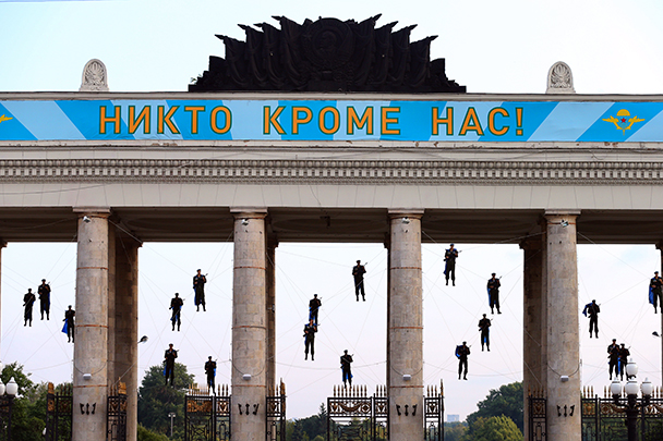 Оригинальное оформление ко Дню десантника получил центральный вход в столичный Парк им. Горького – повешенные на тросах манекены в десантной форме. Сами десантники уже заявили, что ничего хорошего в данной акции не находят (фото: ИТАР-ТАСС)