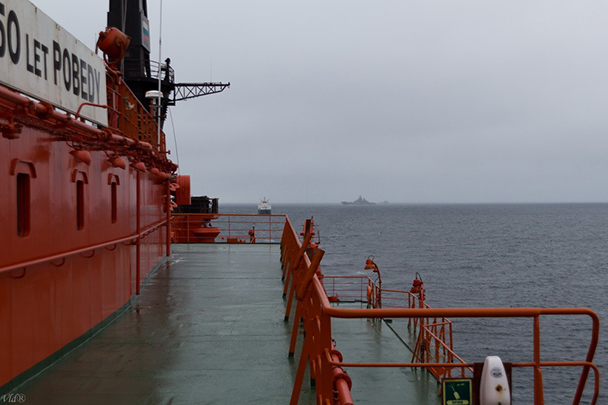 Капитан атомного ледокола «50 лет Победы» Дмитрий Лобусов опубликовал новые фотографии, посвященные недавней арктической проводке флотилии Северного флота. На данном фото – флагман СФ атомный крейсер «Петр Великий». Флотилия начинает входить во льды (фото: Дмитрий Викторович Лобусов/dmitry-v-ch-l.livejournal.com)