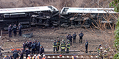 В Нью-Йорке в районе Бронкса сошел с рельсов поезд метро. Перевернулись и упали в овраг на берегу реки Гудзон пять вагонов, в результате четверо погибли, более 60 человек пострадали. Раненых пришлось вынимать через окна, многие находятся в тяжелом состоянии (фото: EPA/ИТАР-ТАСС)