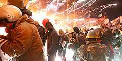 Сейчас противостояние в центре Киева продолжается. Многотысячной толпе протестующих противостоят «Беркут» и бойцы внутренних войск. В данный момент в центре Киева горит Дом профсоюзов (фото: ИТАР-ТАСС)