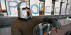 Среди защитников Донецкой областной администрации из числа пророссийских манифестантов появился «рыцарь» в кольчуге и шлеме – участник одного из местных клубов исторической реконструкции. Напомним, что активисты аналогичных украинских клубов массово участвовали в зимних беспорядках на киевском Майдане и даже стали одним из его символов (фото: Reuters)