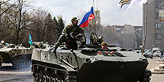 Вот они – украинские БТР с российскими флагами на броне, вызвавшие такой переполох в Киеве. Переход экипажей украинской бронетехники на сторону восставших на Юго-Востоке Украины вызвал у властей страны реакцию, близкую к истерической (фото: ИТАР-ТАСС)