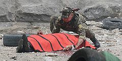 После налета к зданию приехало большое количество карет скорой помощи и пожарных машин. Район здания был окружен людьми в военной форме, они просили людей разойтись (фото: Евгений Биятов/РИА "Новости")