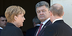 Президент России Владимир Путин несколько минут пообщался с избранным президентом Украины Петром Порошенко. Разговор произошел незадолго до общего фотографирования, которое состоялось перед официальным завтраком в Нормандии, где проходит празднование в честь 70-летия высадки войск союзников (фото: EPA/ИТАР-ТАСС)