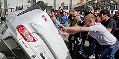 Ощутив свою безнаказанность, хулиганы повели себя агрессивно. Толпа перевернула машины с дипномерами и принялась забрасывать здание дымовыми шашками. Правда, лезть через забор прямиком в посольство она все же не решалась (фото: Reuters)