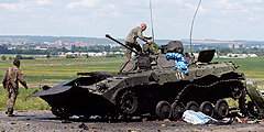 Въезд в Славянск. Эта подорванная БМП принадлежала ополчению Юго-Востока. Теперь то, что от нее осталось, осматривают украинские солдаты. Ополчение под командованием Игоря Стрелкова после ночного боя оставило город и переместилось в Донецк (фото: Reuters)
