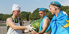 2 августа все, кто служит и служил в ВДВ, отмечают праздник. В Москве десантники прошли крестным ходом от храма в честь пророка Божия Илии до Красной площади. А неформальная часть праздника проходит в парке Горького, где воинам-десантникам бесплатно раздают арбузы (фото: ИТАР-ТАСС)