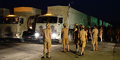Российские КамАЗы везут на Украину 400 тонн круп, 100 тонн сахара, 62 тонны детского питания, 54 тонны медицинского имущества и лекарств, 12 тысяч спальных мешков и 69 электростанций различной мощности (фото: Максим Блинов/РИА «Новости»)