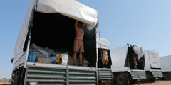 КамАЗы с грузом российской гуманитарной помощи Украине прибыли на границу. Лично ознакомиться с содержимым грузовиков позволили всем желающим журналистам – и зарубежным, и российским. Украинские таможенники приступили к оформлению груза, представители Международного Красного Креста начали его принимать (фото: Reuters)