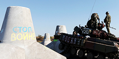 Танк украинских военных с надписями «На Москву» и «Смерть врагам» врезался на въезде в Мариуполь в противотанковый еж, который был украшен белыми голубями и надписью «Стоп войне». Танк при этом буквально развалился на части. Курьезный случай произошел после того, как стороны договорились о прекращении огня (фото: Reuters)