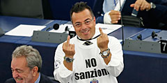 Итальянский депутат Джанлука Бонанно пришел на слушания Европарламента по ратификации соглашения об ассоциации Украины с ЕС в Страсбурге в футболке с надписью «Нет санкциям против России!». На заседании он подчеркнул, что Европа ведет «позорную» и «бесхребетную» политику (фото: Reuters)