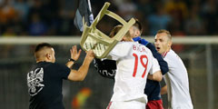 Защитник албанской команды Мергим Маврай пытался помешать сербам оторвать баннер с «Великой Албанией» от дрона (фото: Reuters)