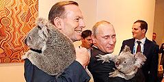Президент России Владимир Путин и премьер-министр Австралии Тони Эбботт на приеме в честь лидеров саммита G20 сфотографировались с коалами. Утром фотосессии с умилительными животными устраивали супруги глав «двадцатки». До начала саммита коал нарочно учили обниматься с незнакомыми людьми (фото: twitter.com/LanaLukash)
