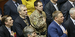 Украинская военнослужащая Надежда Савченко, обвиняемая в России в причастности к гибели российских журналистов в Донбассе, приведена к присяге народного депутата Украины без личного присутствия в зале парламента. Подписанный ею документ был продемонстрирован депутатам Верховной рады (фото: Максим Никитин/ТАСС)