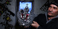 Донецкий мастер по металлу Виктор Михалев изготовил копию короны Российской империи из осколков снарядов реактивных установок залпового огня «Смерч» и «Град». Художественной ковкой Виктор Михалев занимается с 1999 года. За это время принимал участие в различных региональных, национальных и международных кузнечных фестивалях (фото: Валерий Шарифулин/ТАСС )