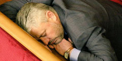 Экстренное обсуждение в Верховной раде бюджета Украины на 2015 год затянулось далеко за полночь, так что у многих депутатов уже не хватало сил на законодательную работу. Как отмечают украинские СМИ, кто-то делал вид, что сосредоточенно работает, а сам дремал, спрятавшись за очками. А, например, выдвиженец националистической партии «Свобода» депутат Юрий Бублик (на фото) спал «в открытую» (фото: twitter.com/HromadskeTV)