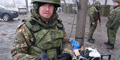 Ополченцы ДНР начали разбор завалов на освобожденной территории аэропорта Донецка. Командир батальона ополчения «Спарта» Арсений Павлов (позывной «Моторола») демонстрирует одну из находок – плеер с аудиозаписями американских проповедей (фото: Николай Муравьев/ТАСС)