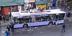 По остановке общественного транспорта в Ленинском районе Донецка нанесен артиллерийский удар. Погибли 15 человек, несколько десятков получили ранения. Власти ДНР заявили о задержании диверсионной группы, которая может быть причастна к трагедии (фото: Николай Муравьев/ТАСС )