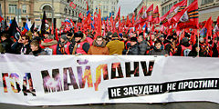 На акцию «Год Майдану. Не забудем, не простим!» в Москве собрались более 50 тыс. человек из сотен общественных организаций, в несколько раз превысив ожидаемое число. Шествие началось от Страстного бульвара и прошло по улице Петровка до Площади Революции (фото: vk.com/antimaidan.russia)