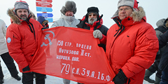 Копию знамени Победы держат в руках, находясь на Северном полюсе, глава Минприроды Сергей Донской, вице-премьер Дмитрий Рогозин, спецпред президента по сотрудничеству в Арктике и Антарктике Артур Чилингаров и министр экономического развития Алексей Улюкаев (слева направо) (фото: Сергей Мамонтов/РИА «Новости»)