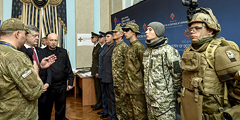 Головные уборы от парадной формы напоминают британские и американские, а кители – российские (фото: Николай Лазаренко/пресс-служба президента Украины/ТАСС)