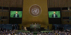 Председателем исторической 70-й сессии Генеральной Ассамблеи ООН был избран спикер парламента Дании Могенс Ликкетофт. Владимир Путин терпеливо ожидал в кресле рядом с трибуной, пока Ликкетофт не объявил его выступление (фото: кадр из видео)