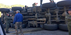 В районе Чемитоквадже недалеко от Сочи перевернулся на горной дороге самоходный зенитный ракетно-пушечный комплекс «Панцирь-С1». В качестве причин инцидента называются размыв дорожного полотна и то, что водитель не вошел в поворот на извилистом серпантине (фото: privetsochi.ru)