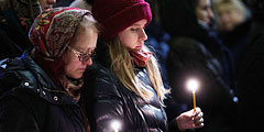 Жители города во время поминального звона в Исаакиевском соборе в память о погибших при крушении самолета Airbus A321 (фото: Александр Демьянчук/ТАСС)