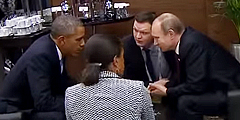 Владимир Путин и Барак Обама кратко побеседовали на полях саммита «двадцатки» в турецкой Анталье. Президенты России и США заняли места в креслах друг напротив друга и более 20 минут разговаривали один на один в присутствии лишь переводчиков. Днем в воскресенье Путин и Обама успели обменяться рукопожатием (фото: кадр из видео rt.com)