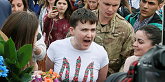 Украинская летчица Надежда Савченко была встречена на родине с большим ажиотажем. Накричав на журналистов и рассказав о планах на будущее, она в сопровождении сестры отправилась на аудиенцию к Порошенко, который заготовил для «героини» пламенную речь и медаль (фото: Gleb Garanich/Reuters)