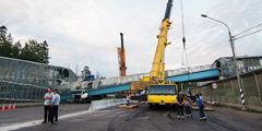 Грузовик MAN обрушил пешеходный мост, перекрыв трассу (фото: Александр Сайганов/ТАСС)