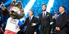 В России голосованием выбрали официальный талисман чемпионата мира по футболу 2018 года. Победителем среди трех финалистов стал Волк Забивака. На фото – талисман чемпионата, вице-премьер Виталий Мутко, телеведущий Иван Ургант и футболист Роналдо на презентации (фото: FIFA/Getty Images/ТАСС)