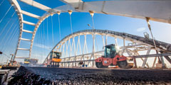 На автодорожной арке Крымского моста строители начали укладку асфальтобетона. На данный момент нижний слой уже готов, верхний уложат через несколько дней – после технологического перерыва. В целом дорожное покрытие пролета будет двухслойным с толщиной в 11 см (фото: most.life)