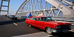 В пятницу уникальные машины из городов России и редкие автомобили из ялтинского Музея автомобильного искусства встретились на Крымском мосту, дав старт первому крымскому фестивалю «Мост» в рамках празднования 180-летнего юбилея Ялты (фото: Сергей Мальгавко/ТАСС )