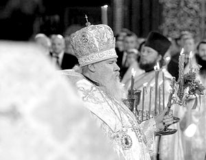 После традиционного праздничного песнопения Алексий II поздравил Путина и Медведева с праздником.