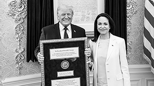 Лауреат Нобелевской премии мира Мария Корина Мачадо посетила 15 января Белый дом, где встретилась с американским президентом Дональдом Трампом и вручила ему подарок – Нобелевскую медаль от премии мира, которую получила в 2024 году.